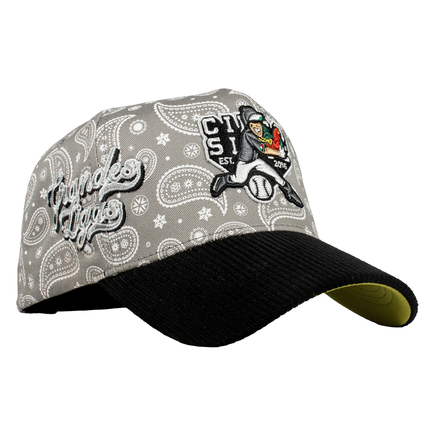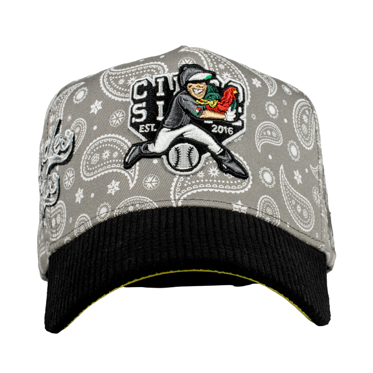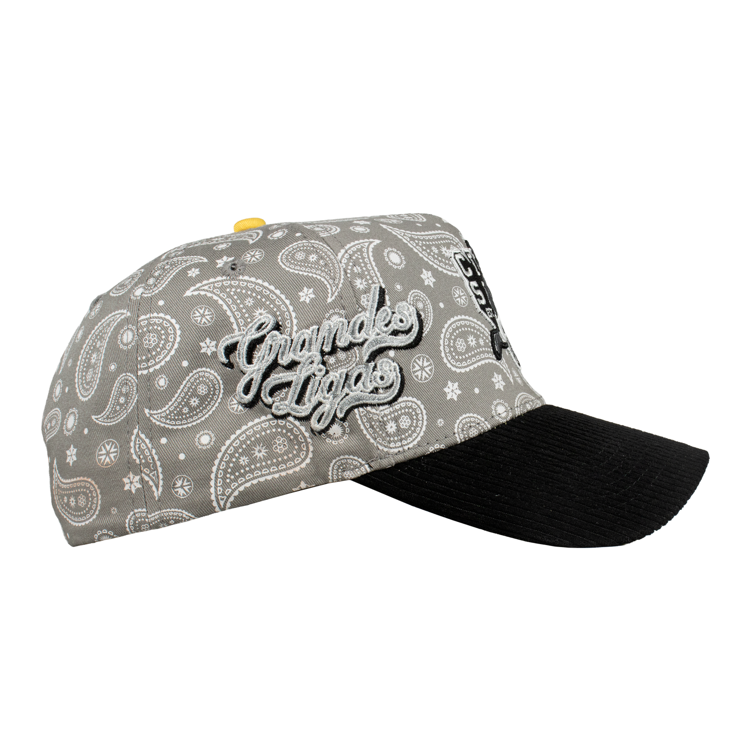 Es una Gorra de 5 paneles, con un Serigrafiado por la parte del Bonete de color Gris enm forma de paliacate , Con un bordado Frontal y un lateral tipo World Series, de otro lado del Lateral el Logotipo de la Marca del color de la gorra, una Visera de Tipo Pana, y un Broche Personalizado.