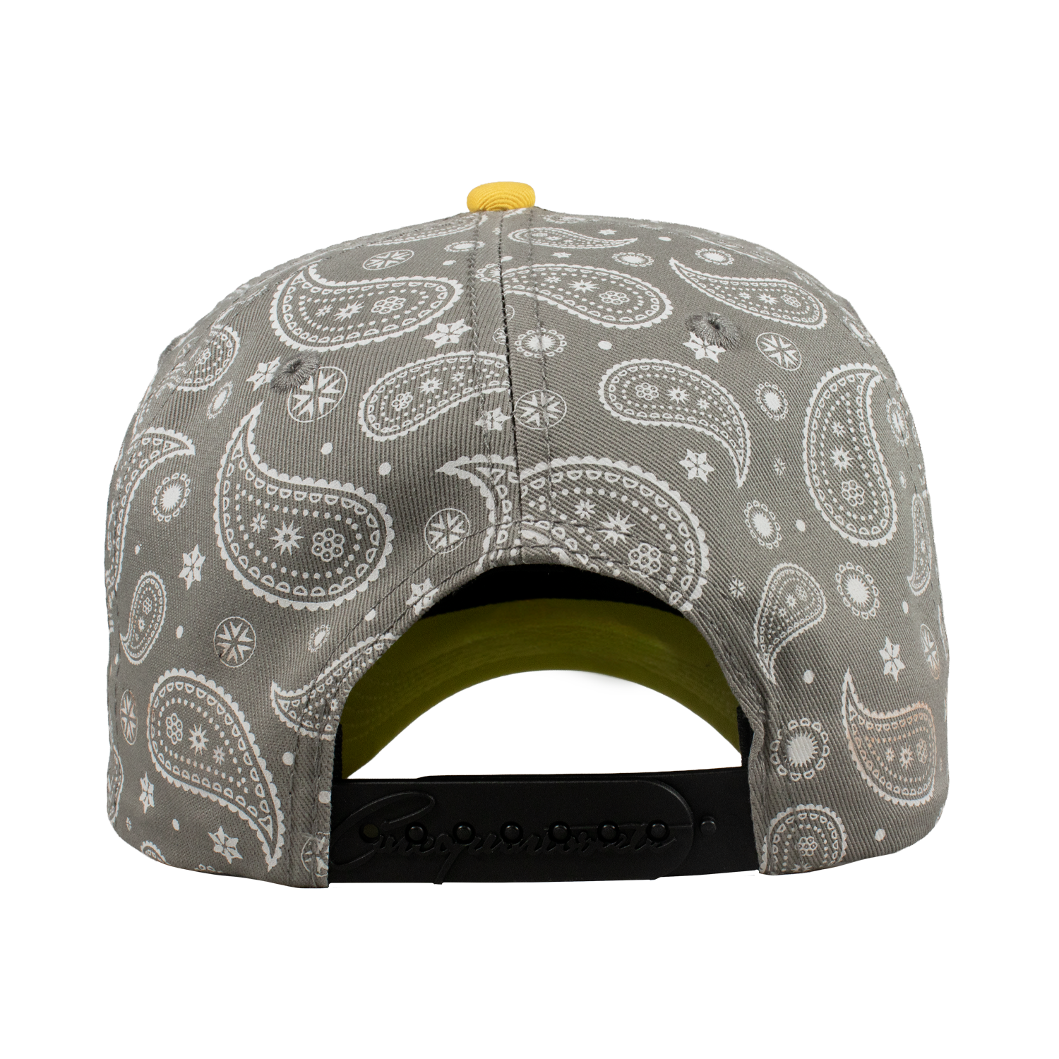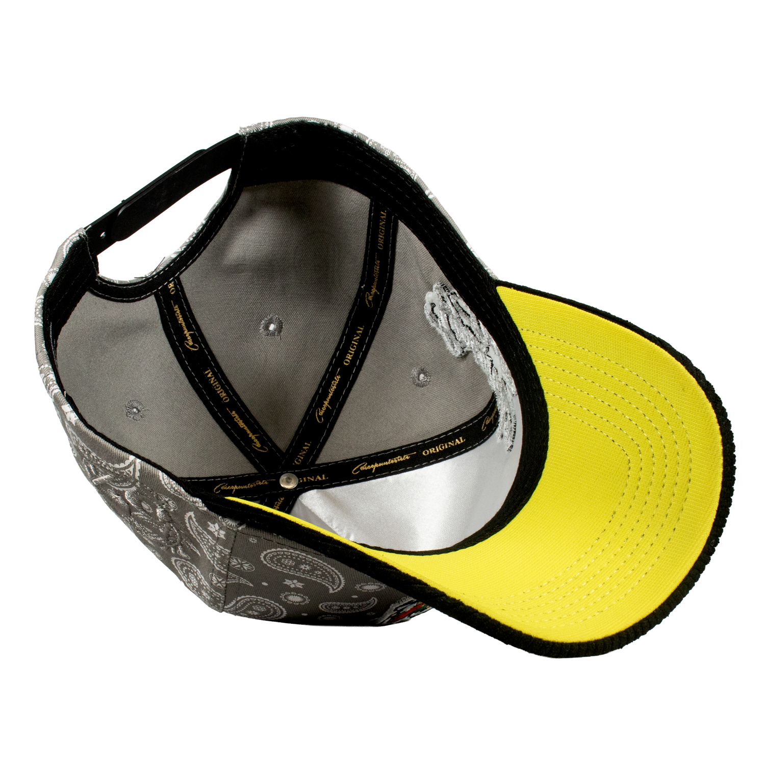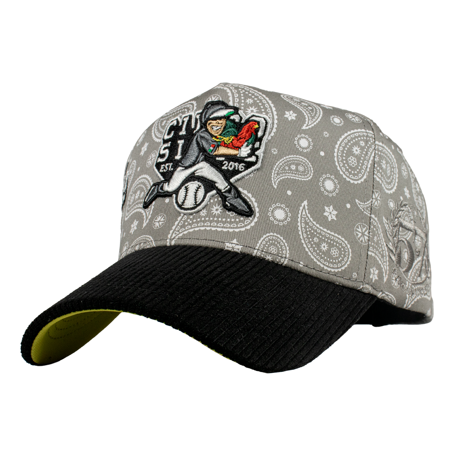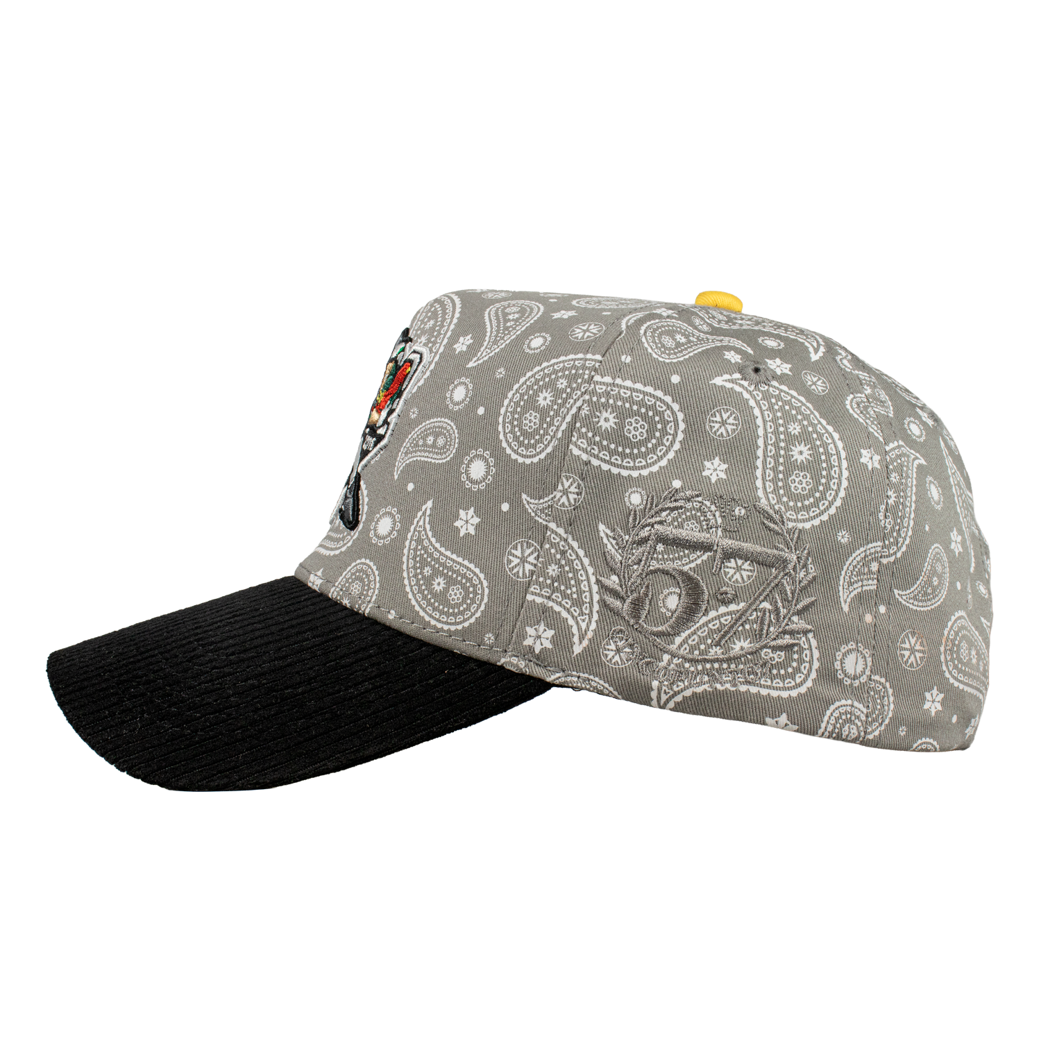 Es una Gorra de 5 paneles, con un Serigrafiado por la parte del Bonete de color Gris enm forma de paliacate , Con un bordado Frontal y un lateral tipo World Series, de otro lado del Lateral el Logotipo de la Marca del color de la gorra, una Visera de Tipo Pana, y un Broche Personalizado.